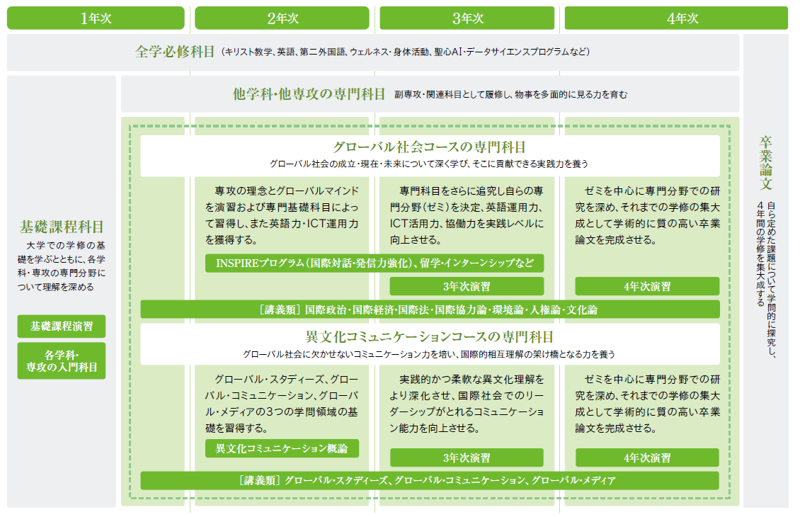 国際政治、国際経済、国際法、国際協力、国際文化論、国際環境論分野の最新の専門知識に裏付けられたグローバルな視野に加え、発信力・協働力・英語運用力・ICT活用力などのスキルを養う。留学など海外体験や各自の個性的なプロジェクトを通して知識を実践に移し、思考力と深いコミュニケーション力で世界の諸課題を解決していく人間を育成する。