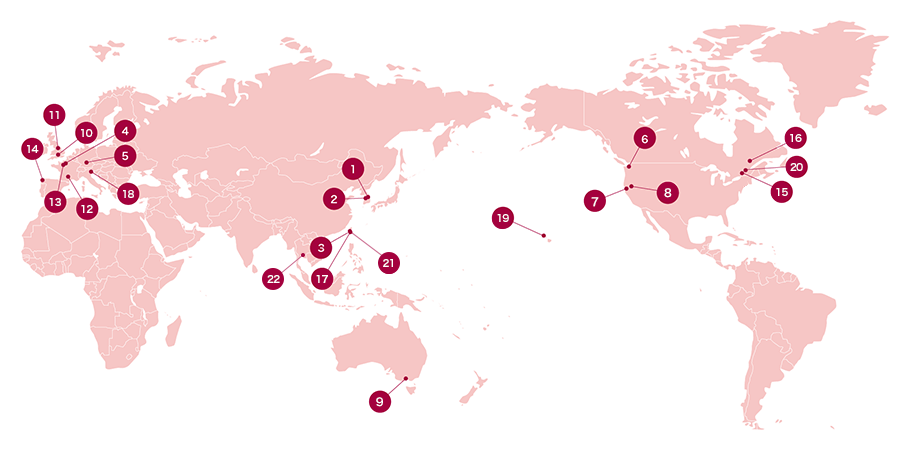 本学では、1974年に米国及び韓国の姉妹校との留学制度に基づく留学生の派遣を開始しました。現在(2025年6月時点)、協定校は22校を数え、累計で400名以上の学生を派遣しています。